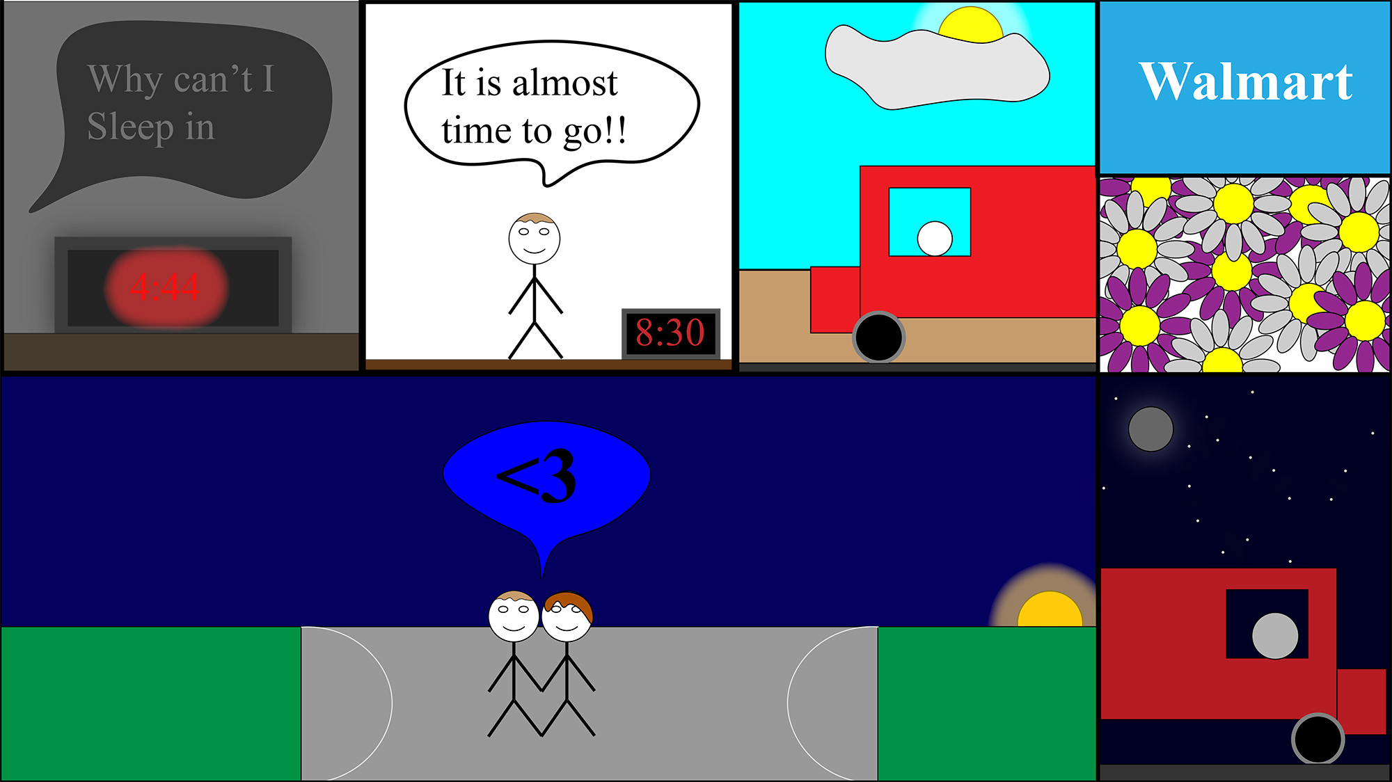 The structure of my comic starts in the morning where I woke up at 4:44. The reason why this is important to know is because before this day for the past week I could not sleep much and was hopping I could sleep that night. The second frame is just me waiting to leave to go to her house to meet her. The third and fourth frame is to show that I bought her flowers. This was important because I wanted to make a good first impression with her and her family and apparently it was a good idea because I was the first person to buy her flowers. The fifth frame I decided to make longer to show that more time has passed, and I also made the sun move to show that it has been almost all day. The reason why this is important is because it showed that I spent all day hanging out with her. The last frame is me going home. I also changed it to nighttime in the last frame because I got drove home at nighttime by my cousin.
