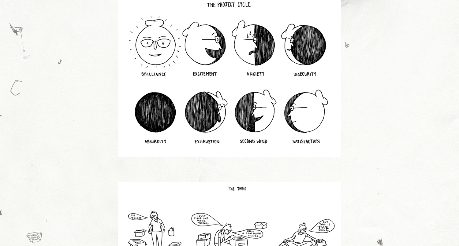 The Project Cycle and The Thing – Two parts of a comic series called Wild Times Project by Eroyn Franklin. They is a screenshot from this website: https://www.wildtimesproject.com/eroyn-franklin/