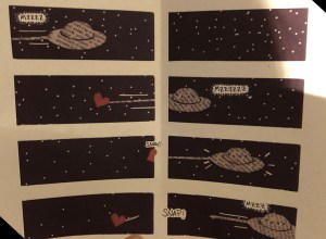 The first exhibit I chose was Dirtbag by Eroyn Franklin. Franklin is a comics artist, illustrator, ceramist, public artist, educator, and occasional shadow puppeteer based in Seattle. On her website, she says that “Dirtbag is an in-progress graphic memoir. In my early 20s I embraced a dirtbag lifestyle fueled by idealism and the search for authenticity in the world of drunks, radicals, and sundry riffraff.” It seems as though Franklin took a bit of a rebel stance in her youth. The illustration seems to be an over dramatized depiction of a family watching their home burn to the ground.