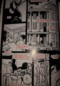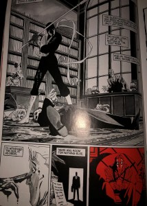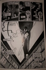 So, to save everyone the trouble, we’ll talk about Scott McCloud’s idea of “closure” and “time frames” instead! According to McCloud, closure is “the phenomenon of observing the parts but perceiving the whole” (63). In this version of a twisted Beowulf, Wagner does exactly this, with a bit of layout help. On page 11 of the novel, Wagner shows a scene of the main character, who happens to be Grendel’s lawyer, being attacked by mob men who he has prosecuted. Grendel then appears as either a well-timed hero or by being summoned by this character, and in the split second of a page-turn and two panels, Grendel has attacked the mob men and killed them, and the scene shows the men lying on the expensive Persian rug in the lawyer’s house.