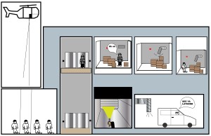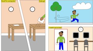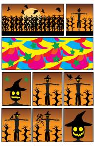 When it came to the creative plan for my comic I started with making a layout and then trying to think of what I wanted to put in it. I didn’t want all my panels to be squares so I started with angled panels that fit together which went through multiple variations. To challenge the direction of how readers read panels fit into this as well, the first three panels reading direction is left to up right then down. The slanted panels have the space in between adjusted to be wider that the top panel to nudge readers towards that desired reading direction, after that however the next four panels can be read in any direction. Clockwise or counter clockwise the reader will read each of those 4 panels in any direction they want before moving down to the panel at the very bottom that is centered. Closure from each one of my panels is mostly subject to subject and scene to scene. The first three panels are subject to subject as the reader needs to read between the lines to find meaning while the scenes staying in a scene or idea. Scene to scene applies to the four panels that can be read in any order as they travel an unknown amount of time and distance. I used linguistic mode to establish a small amount of dialogue, and to infer to the setting and time without actually straight up telling the reader. Under Scott McCloud’s definitions the dialogue is mostly picture specific or additive, as I believe the reader can figure out whats going on without the dialogue, the dialogue is merely “soundtrack” or helping. This was my first time using illustrator in somewhere between 4 and 5 years. I used illustrator for the first time in a web design class in my freshman high school year. I never mastered the program and barely learned basic tools. This time around I learned more tools, and more quickly with the better understanding built on digital tools in general and on past knowledge like already understanding what vector graphics are. For Iconography I used pumpkins, nighttime, and going door to door to let the reader understand it’s Halloween without actually saying that it is Halloween. I also used a bunch of references to Horror movies in each of the 4 any-direction panels, that could be viewed as icons of there referenced movies. Clipping masks were helpful for some panels and layers and grouping were great for specifying what I wanted to move and use. I also used some effects to get things like lighting and the like looking better. I just wish I had better art skills in general so I could do perspective more properly.
