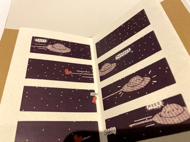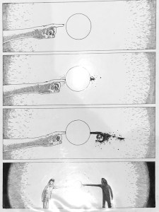 The last panel states “Less than a spec of dust in the cosmos,” paired with a small dot in the center of an otherwise blank panel. This puts you into perspective of possibly the author saying that it doesn’t matter if you, as a human are a plague to the earth or if you are lovable, compared to the cosmos, it doesn’t really matter. The way in which the author uses only a small dot on the page as an illustration provided a unique sense of closure in this comic. Seeing only a ‘spec of dust” it makes the viewer think that it is zoomed out showing Earth from a distance. This transition between the second and third panel would be aspect to aspect because although they do connect and relate because of the human race, it leaves the imagination to the reader as to what they picture between the panels. This could be as simple as looking at the person on panel 2, then zooming all the way out until you only see a spec of dust, or the reader could imagine what might be going on earth, and what everyone is doing, whether they are being a plague, or are being good and lovable.