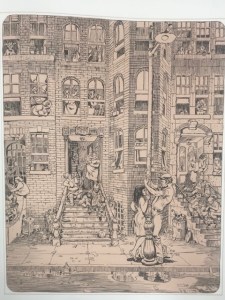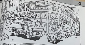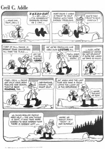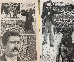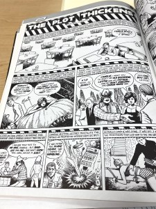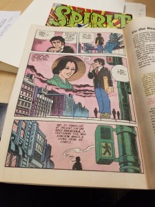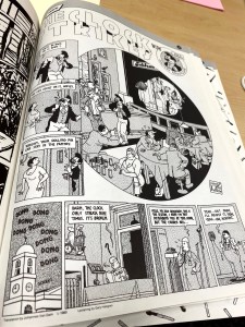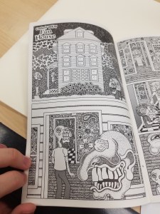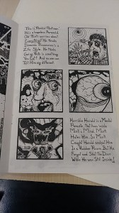 I chose this first image of Sacred Profane because of the way the words were correlating with the imagery. As readers we wouldn’t interpenetrate the man patting the kid on the head if the words were not there. As readers we could see that and think he was removing his hat, hitting him or maybe even blessing him. By having the words pat pat there made it very simple and easy for readers to know what was supposed to be happening. In the background of the same image you can see a car and the sounds the car is supposed to be making, this is helpful for readers because it helps them to know that the car is hectic scene. This is a good example of interdependence because the pat on the head would not translate the same without the imagery or words. The other image from Sacred Profane has a good example of how lines can represent movement. The lines were used to show wind gust, smoke, reflections and even light. Although it is just lines the way it translates into out brains is showing movement and textures. The third image I picked out is from Crazy Men Deluxe. I chose this image because of how literal it is. The comic referred to a “Hole no. 36” and the hole is literally labeled as hole number 36. So even though I would be able to infer that the hole they are going into is the one they’re talking about, but its dumb down even more and is labeled. This could be used as an example for duo specific since the words represent the same thing as the imagery, it could also be seen as an example of montage since the words are used as a part of the picture.