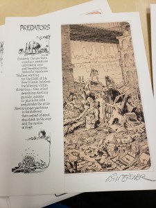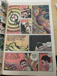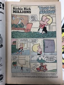 In Understanding Comics, McCloud talks about the word interdependent, meaning words and pictures that go hand in hand to convey an idea that neither could convey alone. An example I found was in the comic “ Richie Rich Millions” In this scene the astronaut seem as though he is being tested to make sure he is prepared to go on a rocket ship to go into space. Theres a part in particular that has a good example of the word interdependent. After what I assume are the scientists, have said that its 5000 degrees below in there, the astronaut replies “I didn’t feel a thing”. If you just read the text itself you would believe that what he says is what he really means. But if you add the visual images to the frame, you can see that he is either lying or being sarcastic. You can tell because the image shows him with ice all over his helmet. And although he might be smiling, you can also see the rough, sharp lines that creates his head shape, that gives off the feeling that he is probably very cold. Looking at the words alone or the picture alone, it wouldn’t convey the same emotion or context as putting them together.