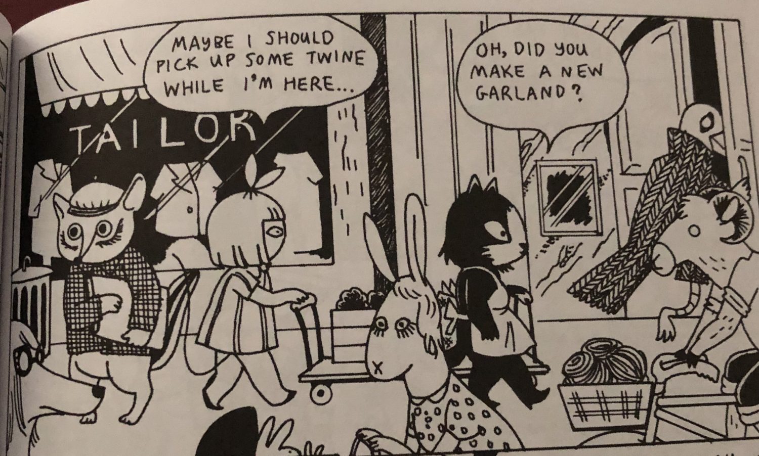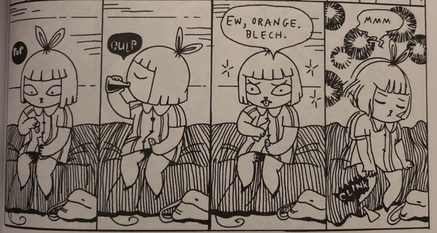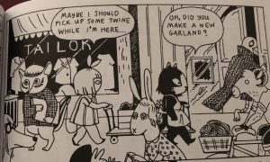 The next thing that I wanted to talk about was how the author portrayed time in this next strip. In the strip it shows the cat laying down on the ground and it looks like it could just be a single image of the cat laying down. There are multiple different things that are happening in the image such as the sound of the tail wagging, then the cat is telling it to stop because he is trying to sleep. I think this is a good portrayal of time in a comic because it separates out the time by putting gutters in between the events that are happening even though if you were to look at the strip you could see it as something happening all at once rather than, tail wagging then cat telling it to stop because he is trying to shleep. You know from looking at the image that first the tail starts wagging and you can hear it because of FWIP FWIP FWIP and then the character hears it too, but he is trying to sleep so he is telling it to stop and it happens in that order.
