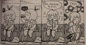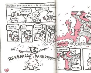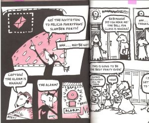 The comic book that I chose to look through was Patrick McDonnell’s, Call of the Wild: A MUTTS Comic Strip Treasury. I chose to read this because the art style looked interesting to me and I think the characters look fun as well. I think it’s comic strips that are all put together in one book. When I was skimming through it there was a particular strip that I thought showed closure very well. On page 45, it shows the cat sitting there, when suddenly all of his fur comes off with the words KA-POOF and then shows all of his fur off in the next panel. I think this represents action-to-action because at one moment the fur is there and the next it is exploding and then in the end it is everywhere and still falling. Even though the character did not move, the fur was the part that had action going on with it and normally with action-to-action it is the character that is doing the action, but in this scene it is the fur that is doing the action.