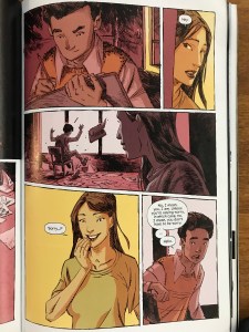 Closure – This page does a fantastic job capturing different thoughts, emotions, and time frames from scene to scene. As a reader, I am able to follow along with the visuals and the linguistics seamlessly. In fact, each panel is laid out from left to right and is aligned with the one next to it with illustrations that stay inside of the panel lines so I don’t even have to read the words in order to gain an idea of what the particular comic strip is about. A part of the reason I chose this page, however, is also because I find this storyline so relatable. When I was younger, I was paranoid about the same thing! I would think about ways to prevent my boobs from being huge like all my grandmas, my aunts, and my mom. This would most commonly happen during family visits, at night, or when I was at sports practices just like in the book.