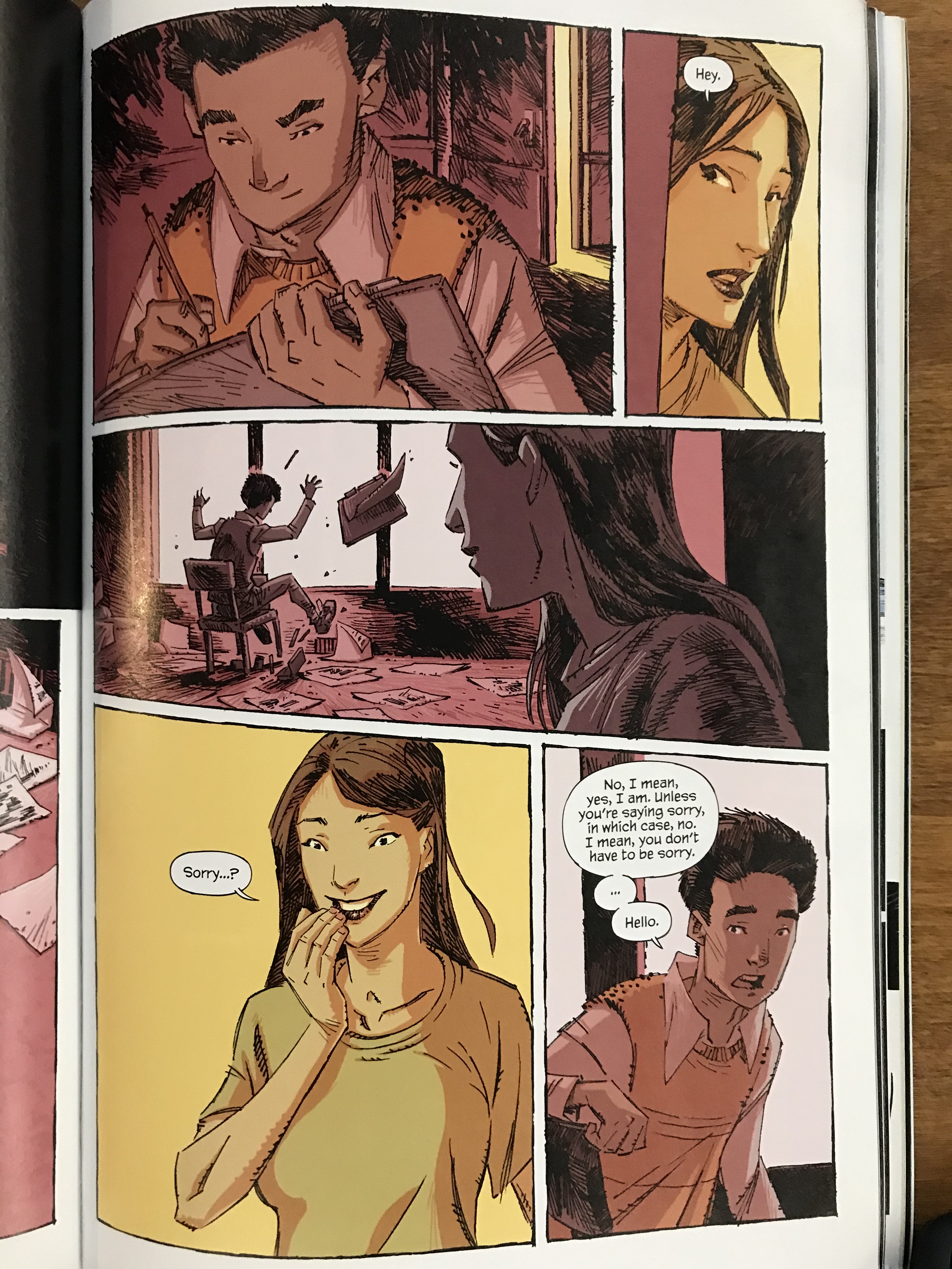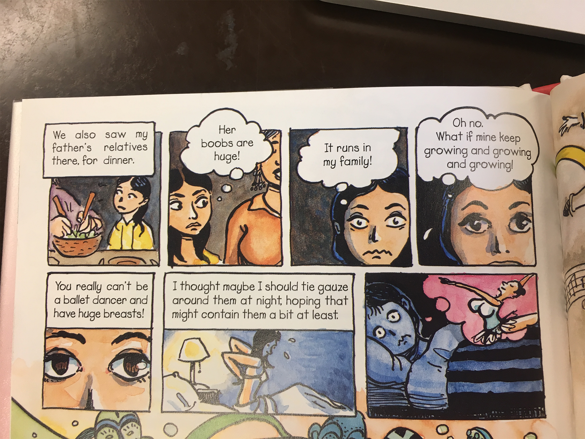 Closure – This page does a fantastic job capturing different thoughts, emotions, and time frames from scene to scene. As a reader, I am able to follow along with the visuals and the linguistics seamlessly. In fact, each panel is laid out from left to right and is aligned with the one next to it with illustrations that stay inside of the panel lines so I don’t even have to read the words in order to gain an idea of what the particular comic strip is about. A part of the reason I chose this page, however, is also because I find this storyline so relatable. When I was younger, I was paranoid about the same thing! I would think about ways to prevent my boobs from being huge like all my grandmas, my aunts, and my mom. This would most commonly happen during family visits, at night, or when I was at sports practices just like in the book.