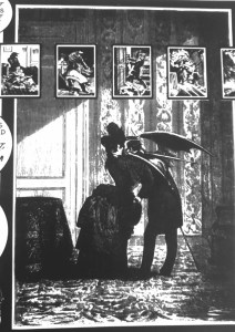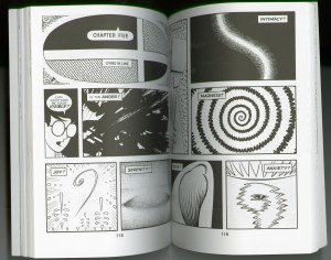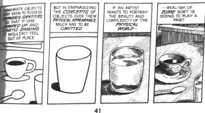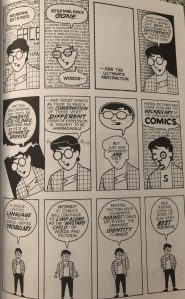 I chose the 188th page in Scott McCloud’s “Understanding Comics” because of the intense use of color in the “window” on the very top of the page. I believe that McCloud’s layout is effective in using shape, direction, and texture. Regarding shape, Lovett stated that a shape is “a self contained defined area of geometric or organic form.” In the middle parts of this page, there are three cubes, each with a different amount of squares in them. Taking that Lovett stated that a shape is an area of geometric form, the example in McCloud’s layout takes this literally in making actual geometric shapes (squares). The upper “window” shows great movement. Lovett stated that vertical movement suggests balance, horizontal movement suggests calmness, and oblique movement suggests movement and action. McCloud’s layout is a great example of oblique movement, seeing that it’s not exactly horizontal nor vertical movement, but a little all over the place/diagonal (oblique). Texture also plays role into this because there is surface quality on the red glove of the figure to the right in the “window” on the top. The lines on the glove suggest that the glove is smooth, but in movement because there’s a sense of retracting or bending on the glove.