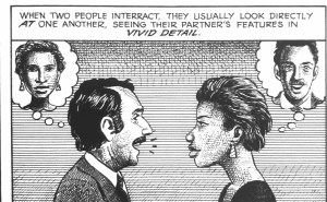 The next principle that I want to look at is dominance. We can see dominance in the panel where Scott McCloud’s character is wearing the large simplistic head. This large head draws the eyes towards the simplistic head and this further empathizes Scott McCloud’s main idea in the section is that humans can create faces out of objects. This large head dominated the small cartoon body enhances the image by giving an example of the idea that humans can see a face out of just two dots and a line.