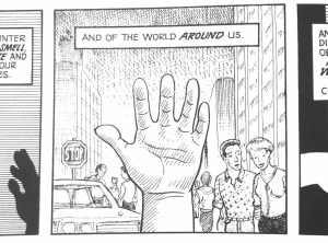 The last principle that I want to talk about on the page is size. Scott McCloud creates a very large face in comparison to the size of the panel. There are words in separate places around the shape and they are very small in comparison. Scott McCloud wants you to focus on the face at first and then read the text. The focus of the reader will shift to the large face and then shifts to the text reading “what are you really seeing” because it is smaller in comparison and shifts back to the large circle with two dots and a line.