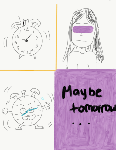 As I began to sketch out the very first shape on my lined notebook paper, I realized that I needed to have a better plan about placement and spacing for my comic. This resulted in me turning the page to start over because I didn’t want eraser marks on my final sketch. Immediately, I thought about how much easier it is to reverse mistakes within Adobe Illustrator. A simple command Z keyboard shortcut is a real game-changer. However, as I continued to draw out my first comic, my old gentle sketch technique began to make a comeback and I found drawing to be very therapeutic like the good old doodling days in high school. In my hand-drawn comic, I used a cartoon frog to represent my high-energy personality.