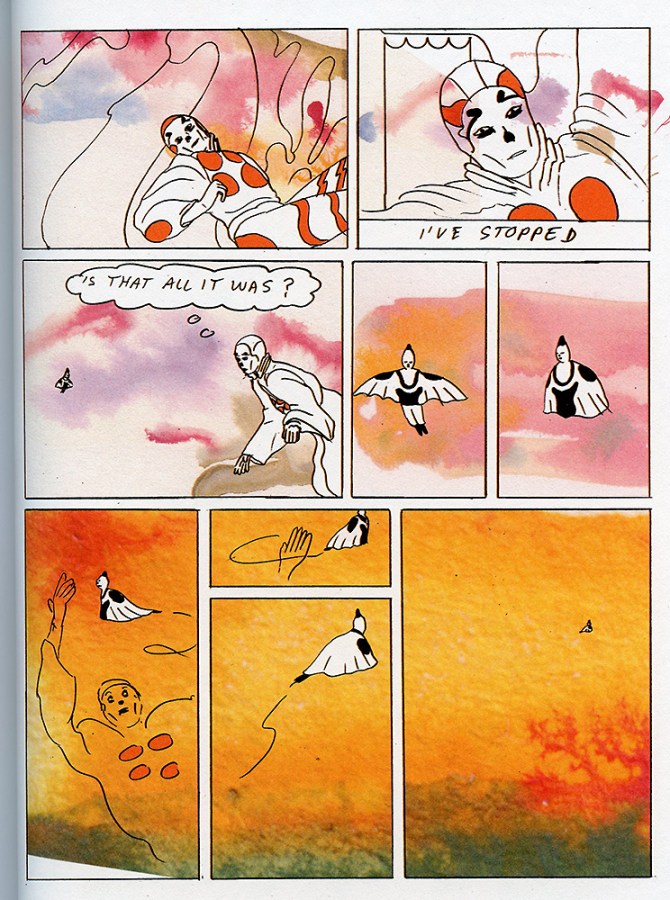 in this case what appears to be watercolor on paper, being reappropriated and combined with line drawings to set the scene and mood of a comic. (Face It by C. F. Scott McCloud, ed. Best American Comics 2014. Boston: Houghton Mifflin Harcourt, 2014. 317.)