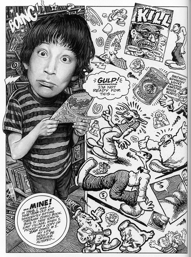 This page from Drew Friedman’s comic about R. Crumb offers an example of how large scale imagery might draw a viewer in while small scale details may add detail and complexity. (R. Crumb and Me by Drew Friedman. Monte Beauchamp, ed. Best American Comics 2016. New York: Simon & Schuster, 2014. 70.)