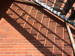 Both 2-D and 3-D aspects architecture present the viewer with interesting textures and patterns. This is the shadow cast by the fire escape on the side of Bryan Hall.
