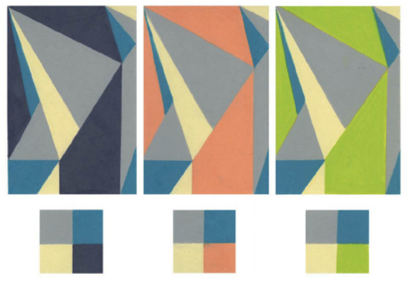 - Save the first pattern as a copy with a new name. Keep the organization of the pattern the same, but change just one of the colors from your scheme in all instances of the pattern. Explain how the new version illustrates the Bezold Effect you read about for today (pg. 25). Write your response on the answer sheet you filled in for Part 2: Color Schemes & Shapes.