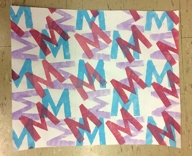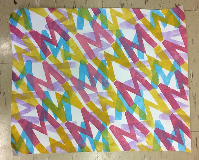Do the best you can to be consistent as you print your stencil. There will be some irregularities and the edges of your shape may bleed outside the edges of the stencil slightly. Try to embrace imperfections. Here are images of the demo we did in class: