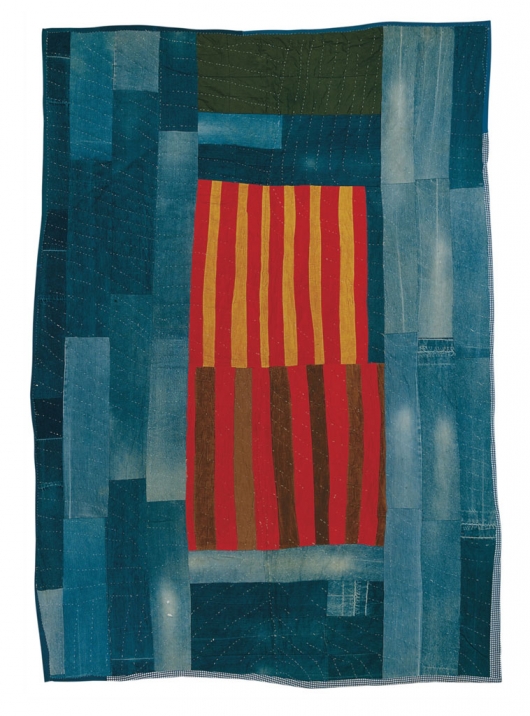 Works made by hand often embrace irregularity within an overall planned structure. The Gee’s Bend quilts offer a great example of this phenomenon. [Work-Clothes Quilt With Center Medallion Of Strips by Annie Mae Young, 1976, Denim, corduroy, synthetic blend (britches legs with pockets), 108 x 77 inches]