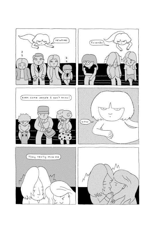 This is a JPG of panels from Exits by Daryl Seitchik, which focuses on the story of a depressed girl working out how to live in society. This scene focuses on the passage of time. The JPG was published by Seite, a publishing group trying to sell more copies of the book. (https://d3u67r7pp2lrq5.cloudfront.net/product_photos/46934281/640_original.jpg)